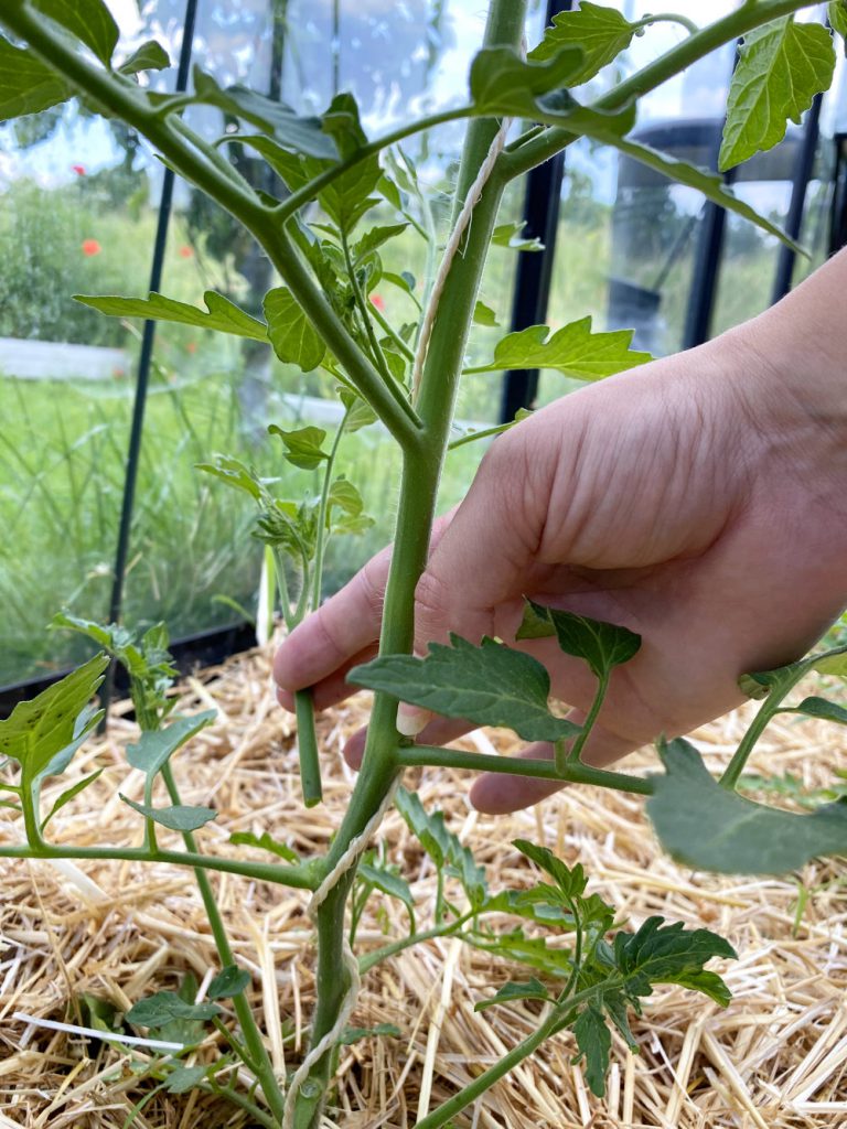 - De plant maakt zijtakken. Takken in de oksel van een andere zijtak en die takken geven ook weer bloemetjes en als je ze laat zitten tomaten, maarrr… deze takken vragen veel energie van de plant, dus het is beter om die zijtakken die in de oksel groeien weg te halen. Dieven noemen we dat. Zo groeit de plant vooral omhoog en kan hij zijn energie goed verdelen.